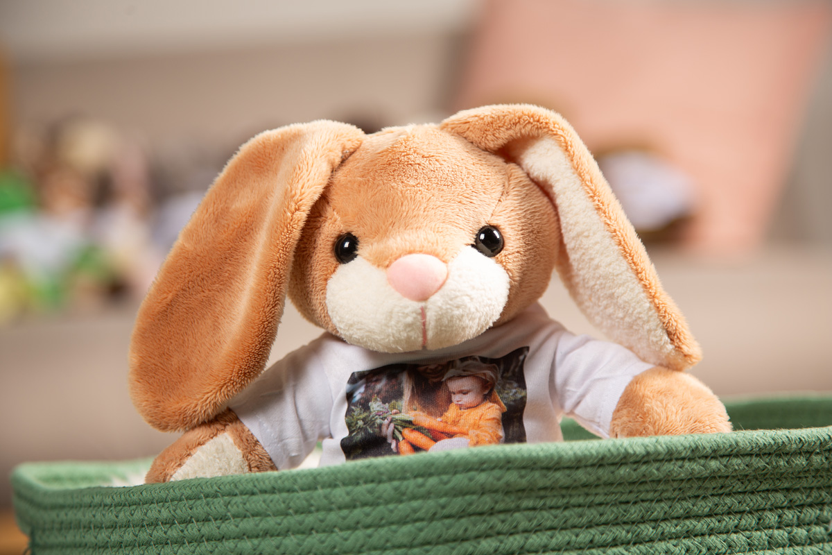 Kuscheltier Helga Hase mit personalisiertem Foto T-Shirt