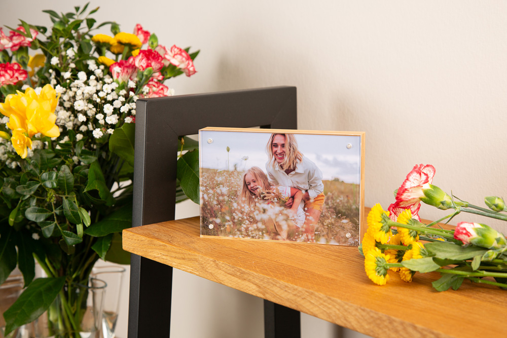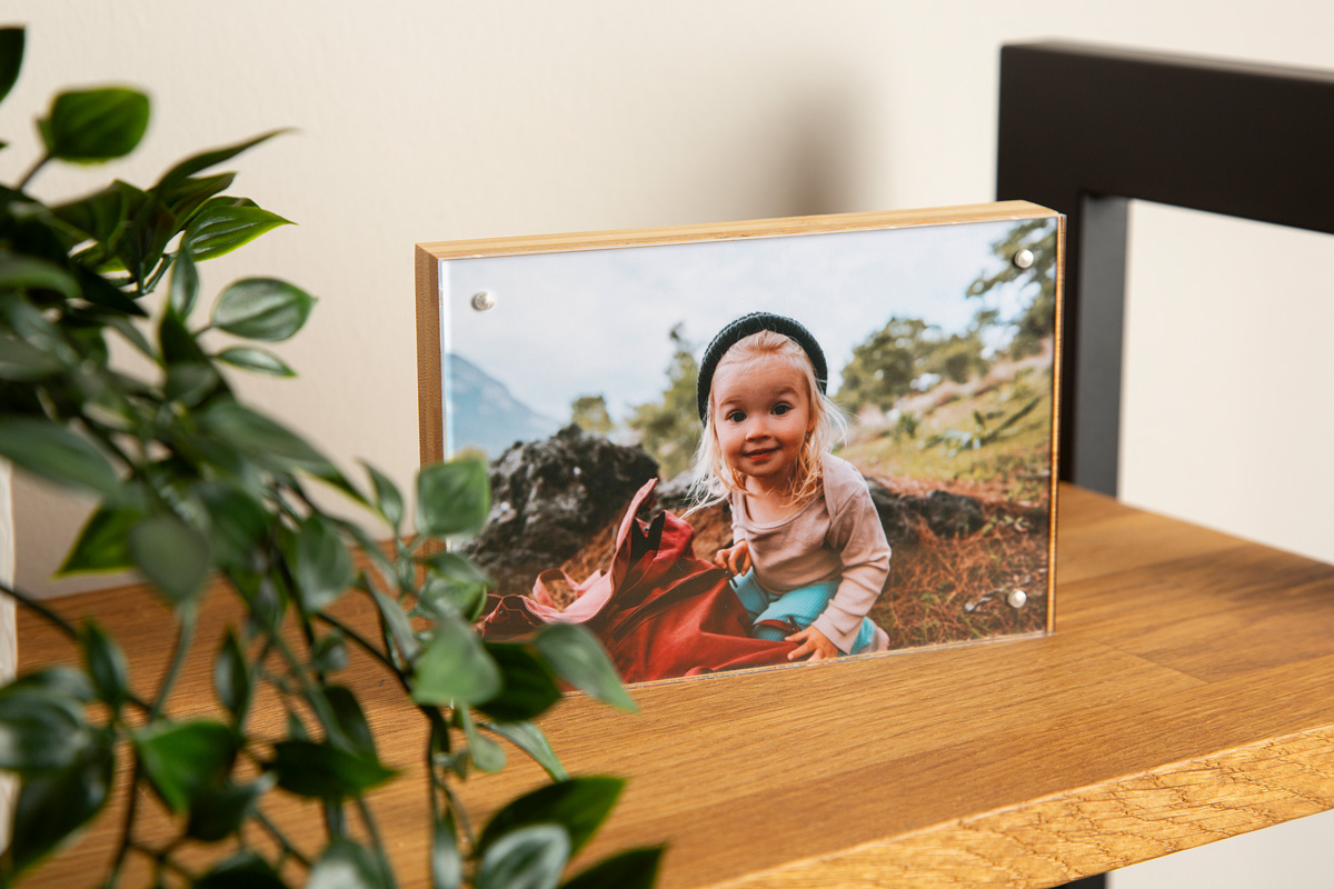 Sie erhalten den Block mit Ihrem Motiv fix und fertig. Wenn Sie es später tauschen möchten, ziehen Sie die Acrylplatte ab, tauschen das Foto aus und legen alles wieder ein – fertig!