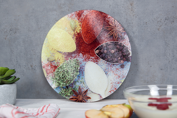 Gestalten Sie Ihr Schneidebrett aus Glas in drei verschiedenen Größen und Eckig oder Rund.
