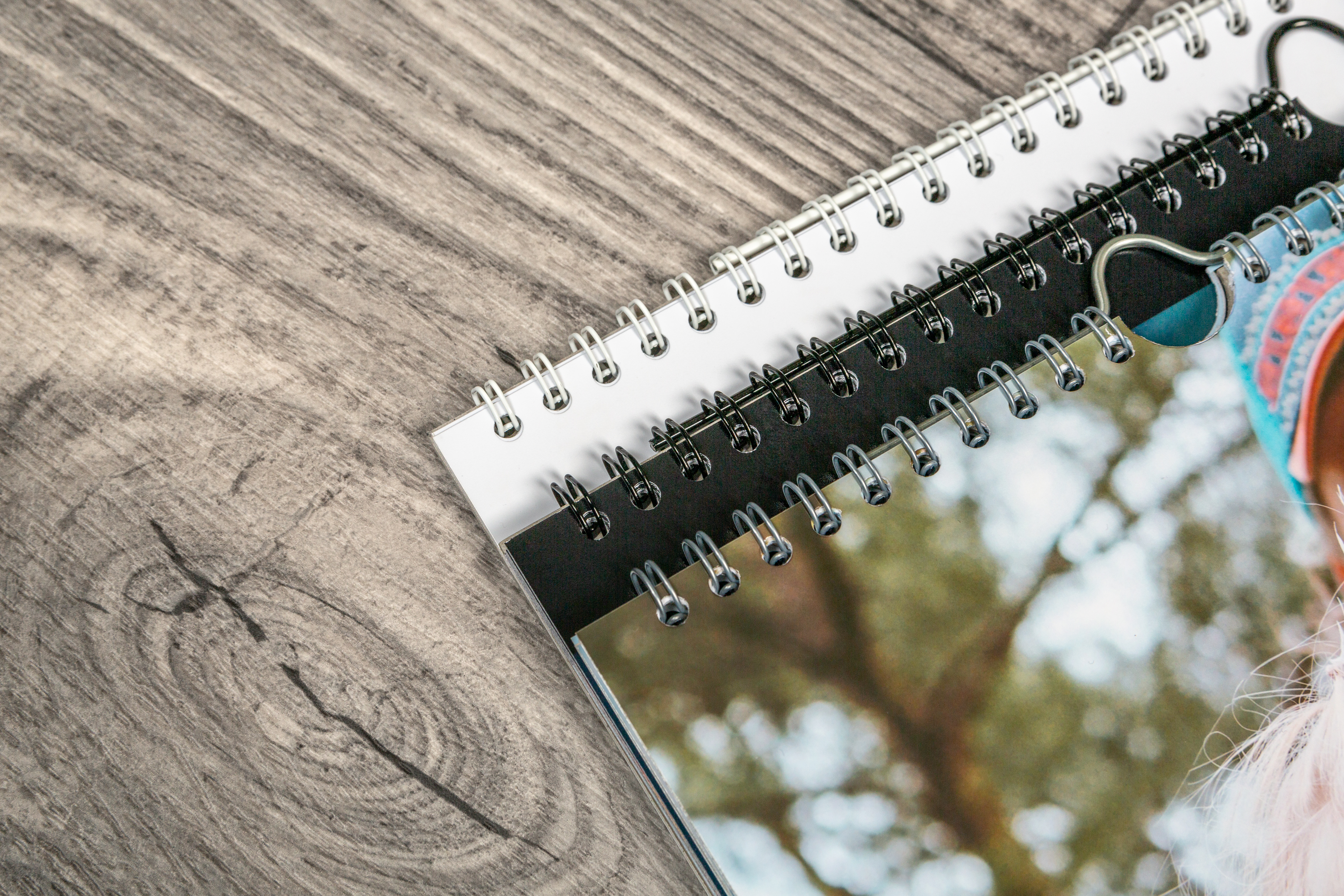Die Spiralbindung ermöglicht es Ihnen, Ihren Kalender bequem umzublättern und aufzuhängen. Zudem können Sie die Bindung aus verschiedenen Farben wählen: schwarz, weiß und silber, passend zu Ihren Bildern.